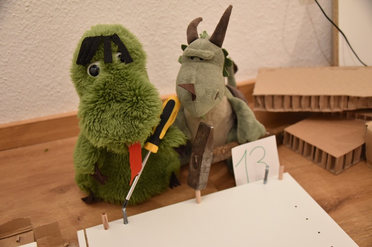 13 Päffchen und Fauchi sind unsere beiden pfotwerklich geschicktesten Drachen und wann immer bei uns im Drachenfamilienzuhause etwas zu bauen oder aufzubauen, zu renovieren oder zu reparieren gibt, ist mindestens einer der beiden zur Stelle, meistens legen sie aber zusammen Pfote an, denn zusammen geht (fast) alles leichter, davon sind sie absolut überzeugt. Das war nicht nur bei den Vorbereitungen für den Umzug in unser neues Drachenfamilienzuhause sehr gut, sondern war uns auch bei vielen anderen Projekten nützlich, zum Beispiel beim Aufbau unseres neuen Zuschneidetischs oder bei der Verlängerung von dessen Beinen…