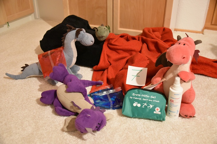 7 Bei einer Familie in unserer Größe bleibt es nicht aus, dass öfter mal jemand krank wird oder Verletzungen zu versorgen sind. Aber egal, ob Drachengrippe, Rückenschmerzen oder ein verstauchter Flügel, unsere Medizindrachin Runa weiß zum Glück immer, wie das jeweilige Plüschi versorgt werden muss, um schnell wieder fit zu werden. Auch unseren Menschen steht sie bei allen Befindlichkeitsstörungen stets mit Rat und Tat zur Seite, egal ob Blut aus der Nase tropft, ein Erkältungsinfekt zugeschlagen hat, ein Spreisel im Fuß steckt oder was auch immer die Menschen sonst noch so schaffen…