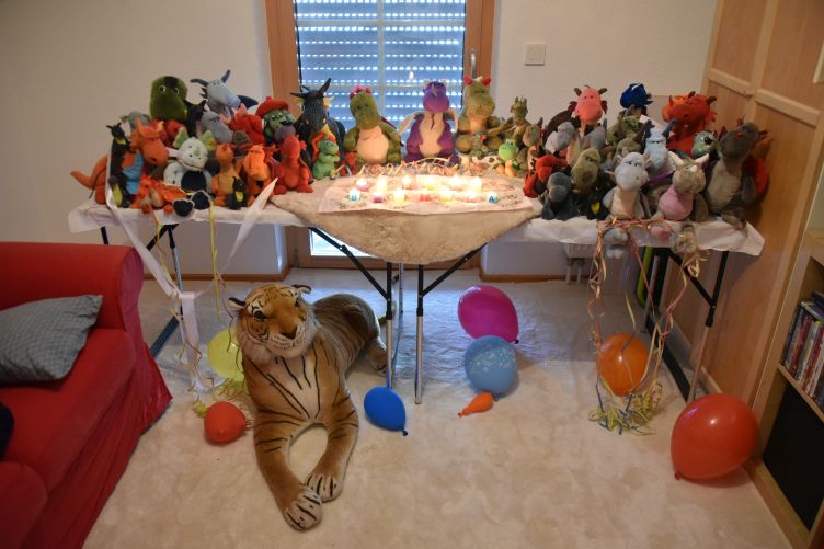 Wir haben übrigens auch wieder ganz plüschitastischen Besuch zur Willkommen-in-der-Drachenfamilie-Feier bekommen. Eine Abordnung der Kölner Plüschifamilie ist nämlich mit ihren Menschen angereist, um gemeinsam mit uns diesen besonderen Tag zu feiern. Wie immer haben wir, während die Gäste zu Besuch waren, unsere eigene große, wenn auch nicht geheime, Plüschiparty gefeiert!